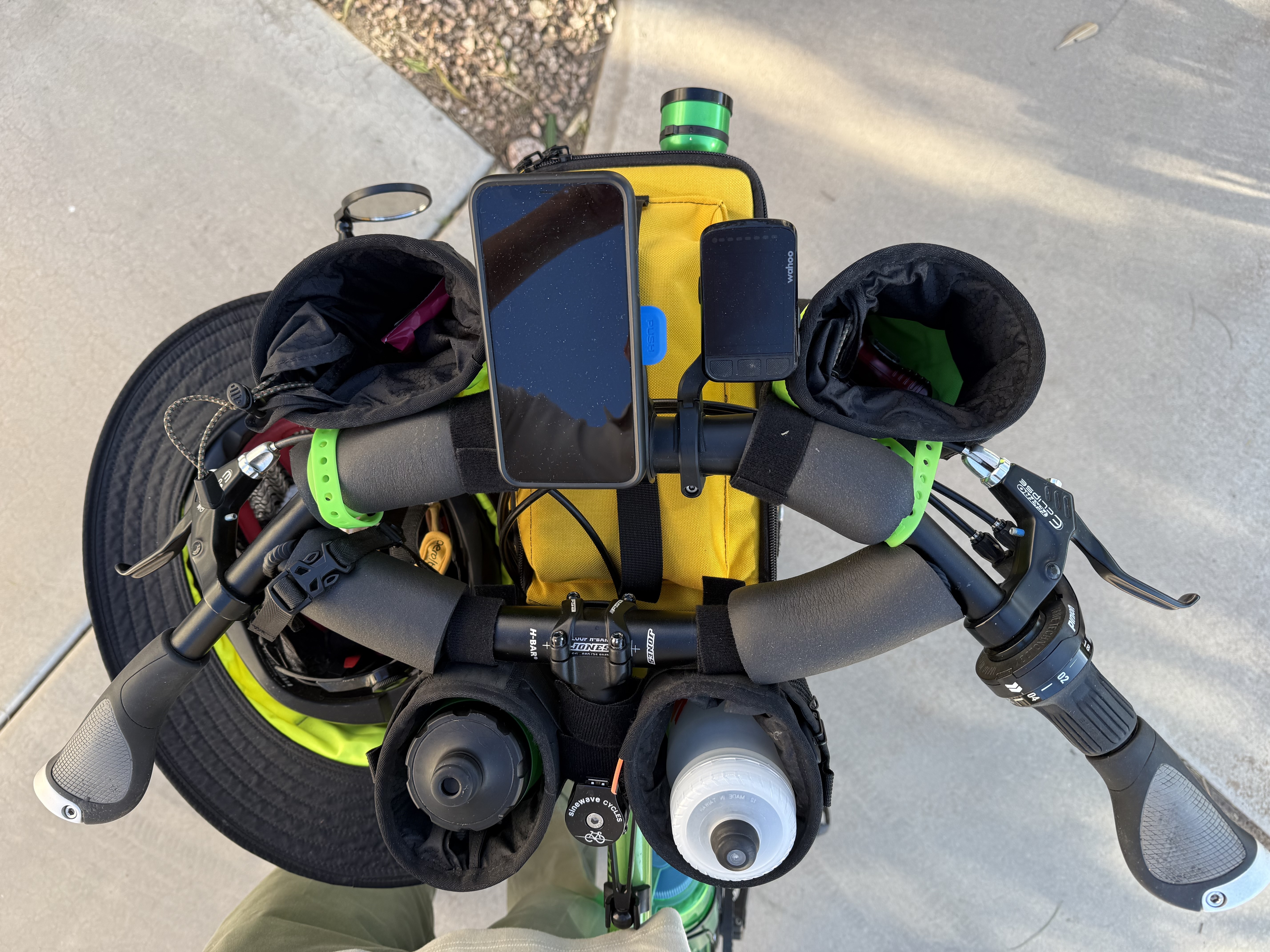03Sep2025: Usery III in late october. i understand hearing is vital when riding, especially since hearing is the fastest of our five senses. there are times though when sustained noise from wind or traffic is draining. so i've been experimenting with Loop Quiet 2 earbuds. i find they basically turn down the volume with a somewhat flat frequency response, which can be useful in those noisy environments. we'll see. 10Aug2025: year 4 begins. new pinion oil, raised stem 5 mm, lubed s&s couplers, super glued the rubber flag mounts to the rear rack (no more motion!). 26Jul2025: i got stung 3 times by the same arizona bark scorpion on the top of my right foot. it had crawled into my sock. didn't even feel the avtual sting, but my foot swelled up real good. paralysis is how i would describe the feeling. took me off the bike for ~3 weeks. 18Apr2025: the bearikade is useful. it consolidates food storage and is critter proof. it fits perfectly in the rear basket. when it is outfitted with insulation and a coldpack, one can enjoy ice cold milk and a proper sandwich on day rides, even after several hours in the phoenix desert and foothills. 04Apr2025: usery II. this is a ≃40 mile home-to-campsite ride with ≃1100 ft vertical difference. much better this time around, in many regards. a few thing to improve upon, such as bigger bags for the ground cover and the rain fly - they must be easier to get in and out. onwards to usery III in the late fall. then i'll think about a longer trip to catalina state park near tucson.